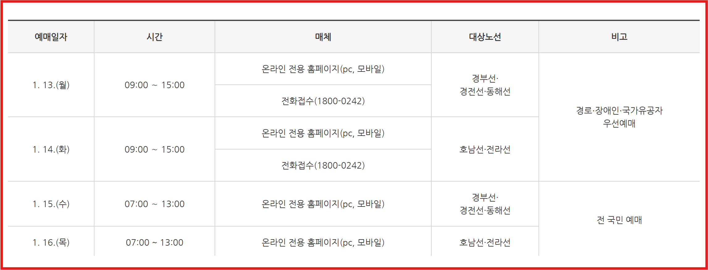 1월 13일(월) | 09:00 ~ 15:00 | 온라인(PC, 모바일) | 경부선, 경전선, 동해선 | 경로·장애인·국가유공자 우선예매 |